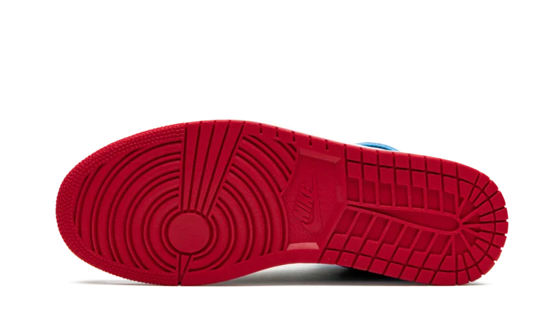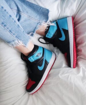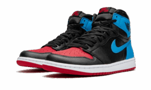 This Jordan 1 is composed of a black tumbled leather upper with red and university blue overlays. A white midsole, red outsole, and classic Nike branding on the tongue complete the design.