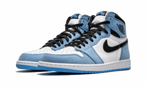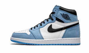 Buy AJ Jordan 1 High University Blue Shoes which are composed of a white leather upper. Coupled with this we find the university blue on the major part of this model: the heel, the toe, the passage of the laces and at the level of the ankle. To contrast these light colors, black is present on the quarter panel, at the laces and on some branding elements, namely: the swoosh and the Wings Logo. The “Nike AJ” inscription on the label is sky blue. To complete the design of Peter Moore, the midsole is white and contrasts the sky blue of the outsole.