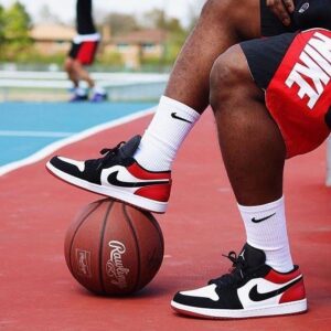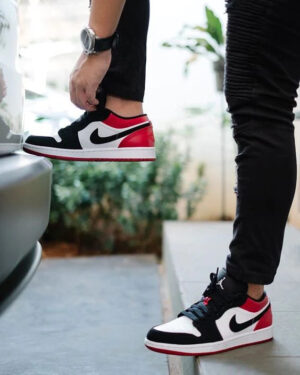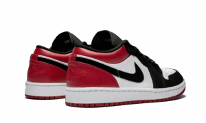 La AJ Jordan 1 Low Black Toe is composed of a white leather base . If the American firm has decided to give it this color, this model does not completely retain the same characteristics as the Black Toe OG. Indeed, we find an alternation between leather and nubuck . The front of the pAJ and the swoosh are black nubuck whereas usually we faced leather. The heel is made of red leather with the Jordan Wings embroidered in the same color. On the tongue, we notice the mention 23 in black on a red background at the level of the laces loop. The Jordan logosewn on the tongue is white. Finally, a two-tone sole completes the design with a midsole in white and an outsole in red.