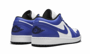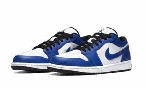The AJ Jordan 1 Low Game Royal is adorned with a white leather upper enhanced by premium leather inserts in Royal Blue. On the laces, we find a touch of black as for the Wings Logo and the outsole which allows for a contrast. The side swoosh and the Jump man on the tongue are both in Royal Blue to match the set.