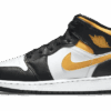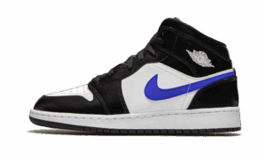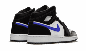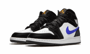 The AJ Jordan 1 Mid Black Racer Blue White consists of a black shiny nylon upper. For the inserts, we find smooth white leather as well as aside swoosh in smooth blue leather for a little touch of color with the yellow Jumpman on the tongue. The Wings Logo on the ankle appears in white just like the midsole.