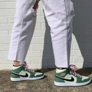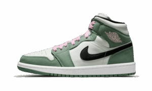The women’s AJ Jordan 1 Mid SE ‘Dutch Green’ softens the classic silhouette with a spring-ready palette made up of contrasting pastel hues. Varying pale green shades are executed on the leather upper, accented with a black Swoosh and a pink Wings logo on the lateral collar flap. Matching pink hits land on the sneaker’s laces and woven tongue tag, featuring standard Jumpman branding. The mid-top is mounted on a rubber cupsole with encapsulated Nike AJ cushioning in the heel.
