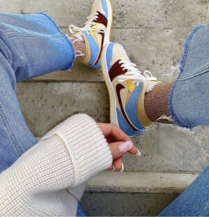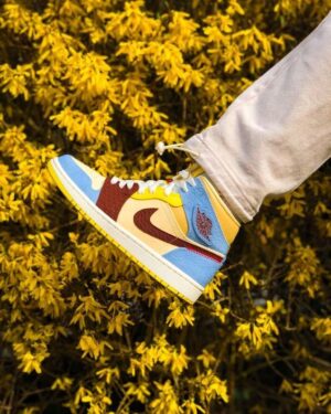 The two brothers, creators of MCR , used the symbolic colors of the brand symbolizing Africa, which are blue, brown and touches of yellow. The mix of textures is accentuated by small patterns on each piece. The tips of the laces echo the colors of the pAJ. The yellow outsole and cream midsole are added to the Jumpman logo on the tongue as well as the Wings Logo . The Maison Châteaux Rouge name is on the back accompanied by a few red stitching on the sides of the ankle. Its originality and its rarity make it essential , it is the touch of color to bring to your outfit!