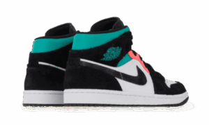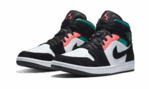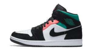 This AJ Jordan 1 Mid SE South Beach bi-material, mixing black suede for the inserts, and the swoosh in contrast with the smooth white leather of the upper. For a touch of color, we find pink on the eyelets and the Jumpman . And to complete the ensemble, a touch of green on the ankle collar and the Wings Logo .