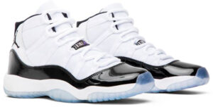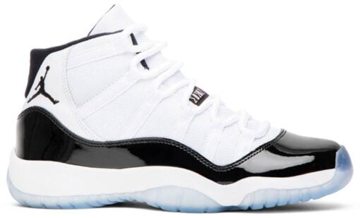The AJ Jordan 11 Retro GS ‘Concord’ 2018 features the same design hallmarks as its full-sized counterpart, starting with the ballistic mesh upper in white. The upper transitions to a black patent leather mudguard, which then gives way to a translucent rubber outsole fitted with the Concord herringbone-tread inserts that give the shoe its name.