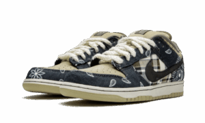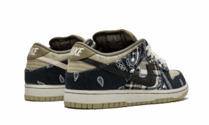 The Travis Scott x Dunk Low SB shows off a unique patchwork motif on the upper, featuring a tan leather base with plaid quarter panels and paisley print overlays, the latter made to tear away to reveal hidden elephant print underneath. The dueling patterns are complemented by rope laces, Cactus Jack tongue tags and mismatched black and pink Swooshes on each shoe. A white midsole and tan rubber outsole anchor the complex design.